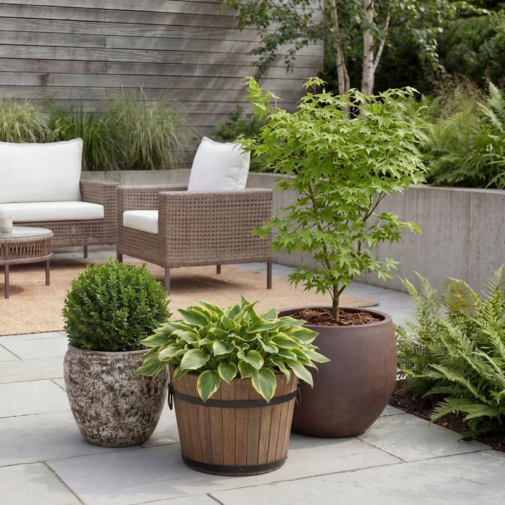 Den matte overflaten og solide formen passer perfekt til buksbom og små prydtrær – men også til mer eksotiske planter som cordyline.