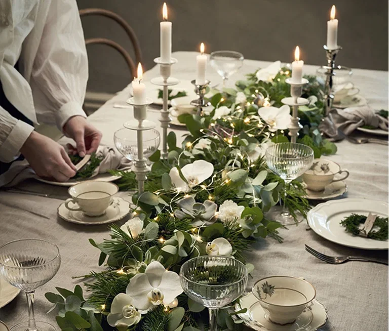 Til nyttår er avskårne blomster herlige og luksuriøse som innredning til hjemmet. Kjøp en ferdig nyttårsbukett i gnistrende hvitt og sølv. Eller hvorfor ikke lage din egen med hvite tulipaner eller roser, noen grønne kvister og blåbærris? Det skaper en eksklusiv og stemningsfull bukett som passer både hjemme hos deg selv eller som gave på nyttårsfesten.