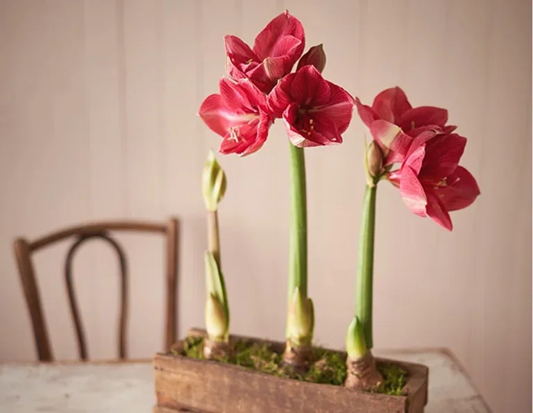 Tenk på at alle løkvekster trenger mye lys for å unngå å bli for lange eller hengende. Da risikerer de å brekke eller velte. Velg derfor en tung potte som står stødig. Når amaryllisens stilker har sluttet å vokse i høyden og blomsterknoppen er i ferd med å bryte ut, kan du sette den et sted med bare 5-8 plussgrader. Da slutter den helt å vokse. Deretter kan du ta den frem igjen når du vil at den skal slå ut i full blomst.
