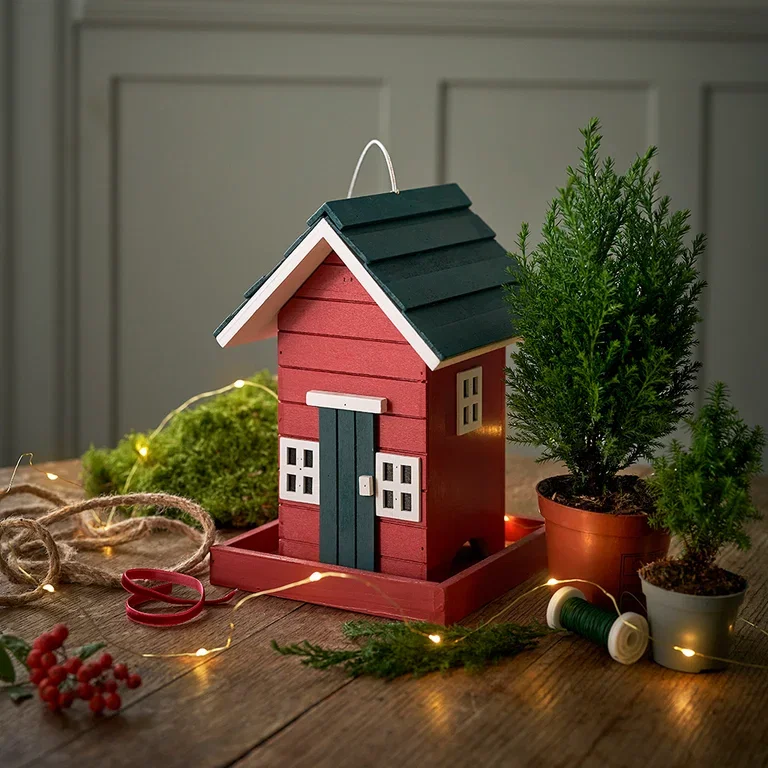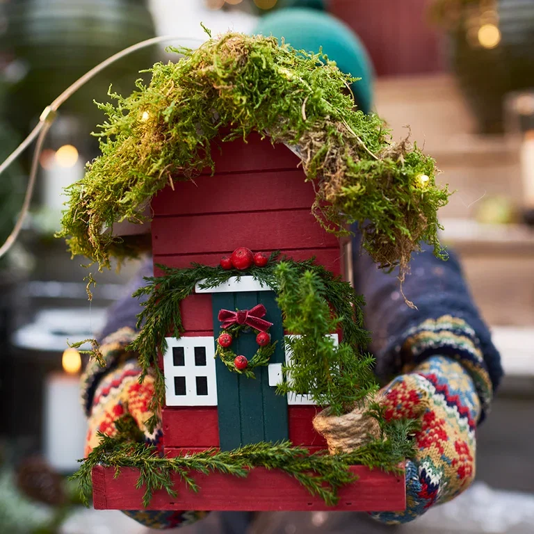 En fuglemater kan med enkle grep bli riktig så julete. Se hvor fint det ble da vi pyntet dette Plantasjen-fuglehuset med mose, noen vintergrønne kvister, litt rognebær og en liten lyslenke: