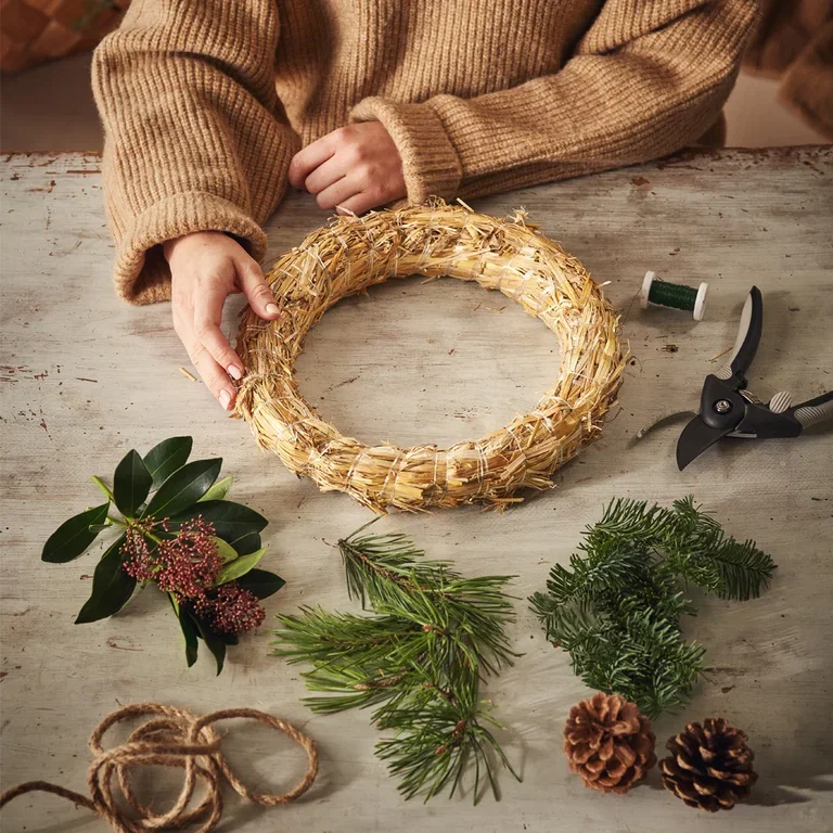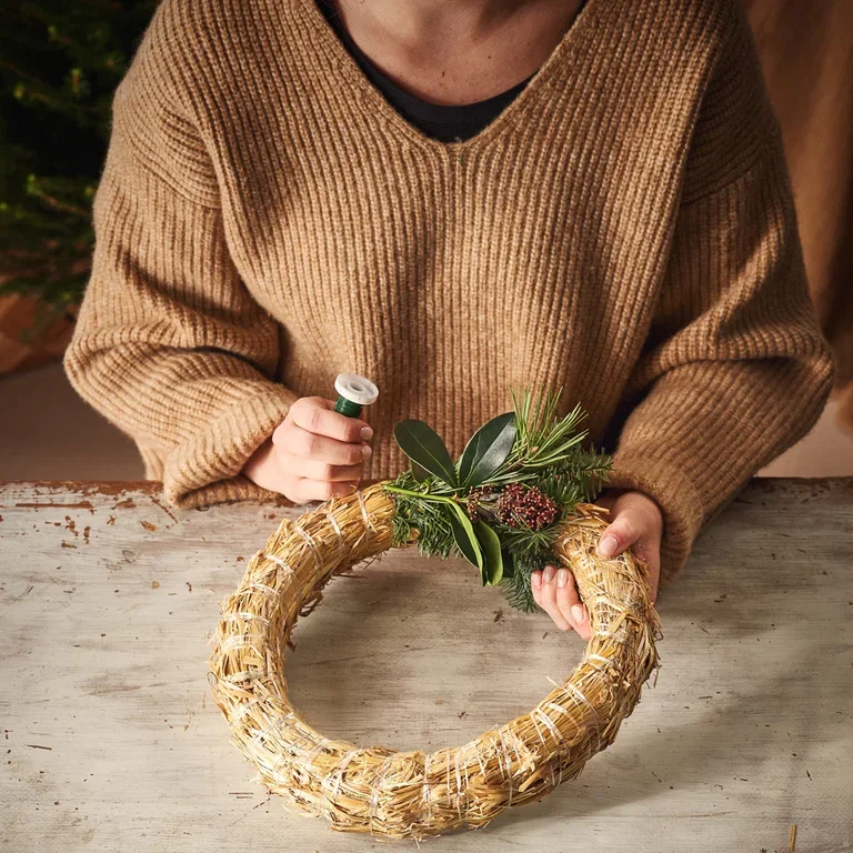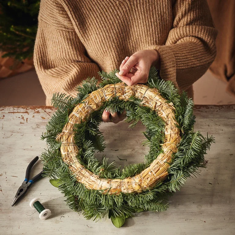 Utgangspunktet for å binde en krans med halmkrans er det samme – uansett om du lager en høstkrans av lyng, en mosekrans eller en krans med vintergrønne nåletrær, som vi viser her.