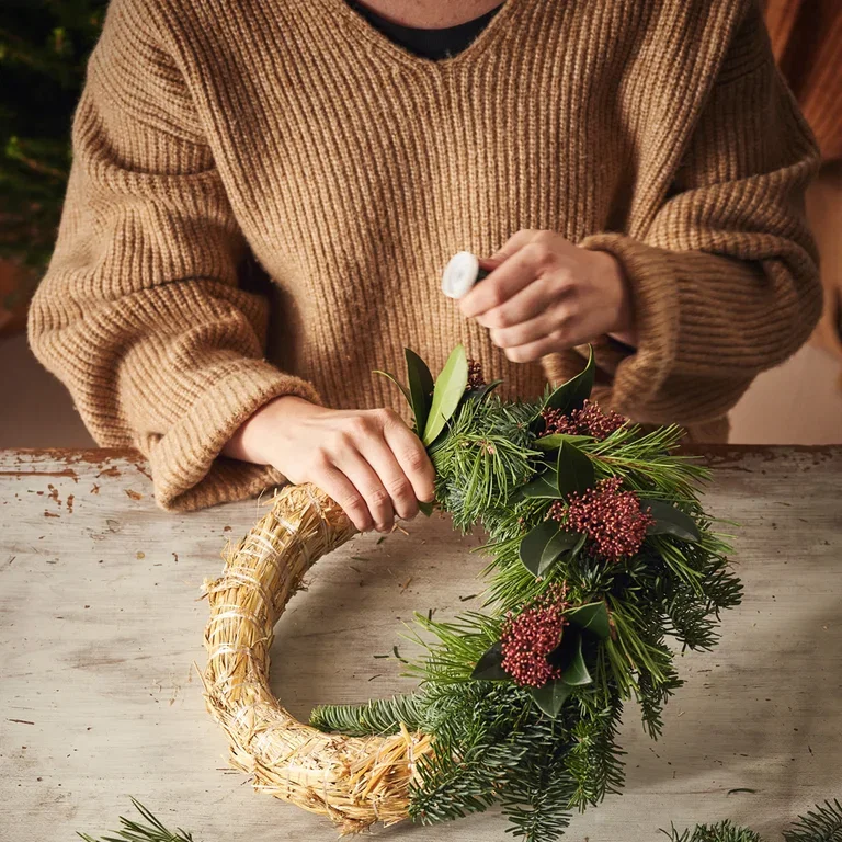 TIPS! For å få en jevn krans er det lurt å feste bukettene i et mønster. Du kan for eksempel feste annenhver bukett av furu og gran, eller la hver tredje bukett inneholde skimmia. Prøv deg frem for å se hva som blir fint – det er bare fantasien som setter grenser!