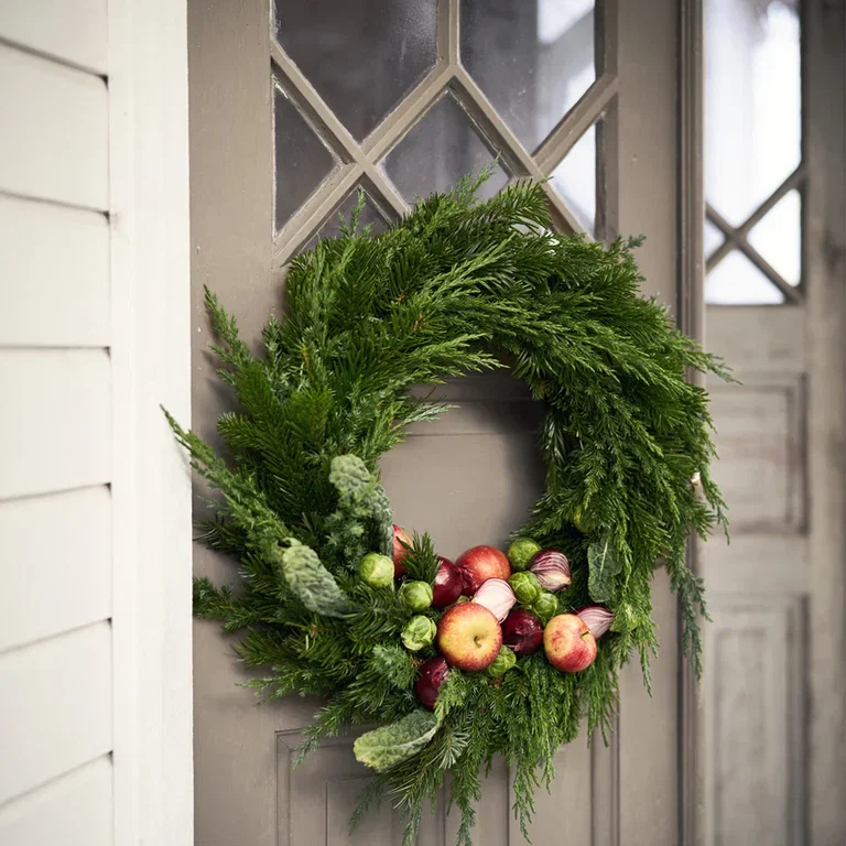 Bruk gjerne materialer du har i huset og i hagen. Her har vi brukt palmekål, rosenkål, rødløk og epler til å pynte kransen med. Til stammen har vi brukt thuja, gran og einer. Prøv deg frem!