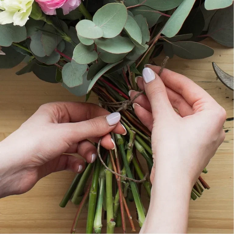 Når du er fornøyd med størrelsen og formen på buketten, binder du buketten sammen med hyssing, blomstertråd eller et fint bånd. Pass på at det er stramt nok til å holde blomstene på plass, men ikke så stramt at du skader stilkene.