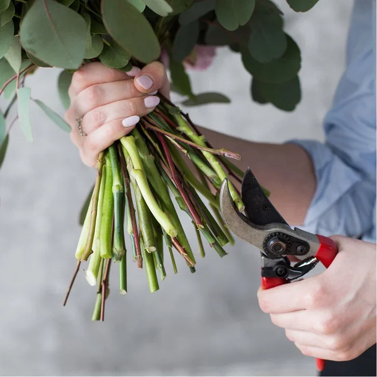 Begynn med å rense stilkene – fjern alle blader som kan havne i vannet når buketten skal settes i vasen. Da unngår du skittent vann, og du får buketten til å vare lenger.