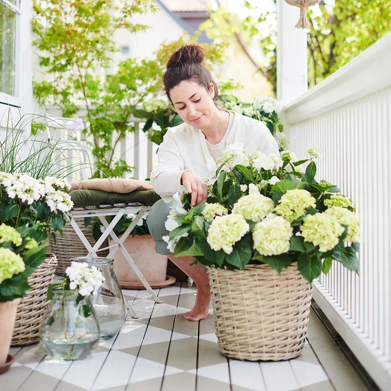 Stuehortensia (innehortensia) er perfekte inneplanter, men kan flyttes ut på balkongen eller settes i hagen om sommeren (når det er over 15 grader døgnet rundt). Gi næring, for eksempel surjords-gjødsel annenhver uke.