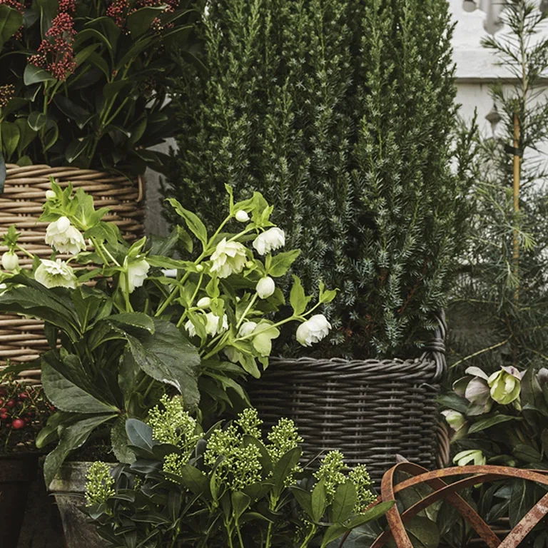 Er det plussgrader eller noen få minusgrader kan du med fordel plante en sammensetning av ulike juleroser i inngangspartiet. Det gir et blomstrende og innbydende inntrykk. Velg en frostfri potte med dreneringshull i, og plant rosen sammen med andre frostbestandige, vintergrønne vekster og dekorer med mose. Flytt potten inn i uterommet, på balkongen eller et annet svalt uterom på de kaldeste dagene.