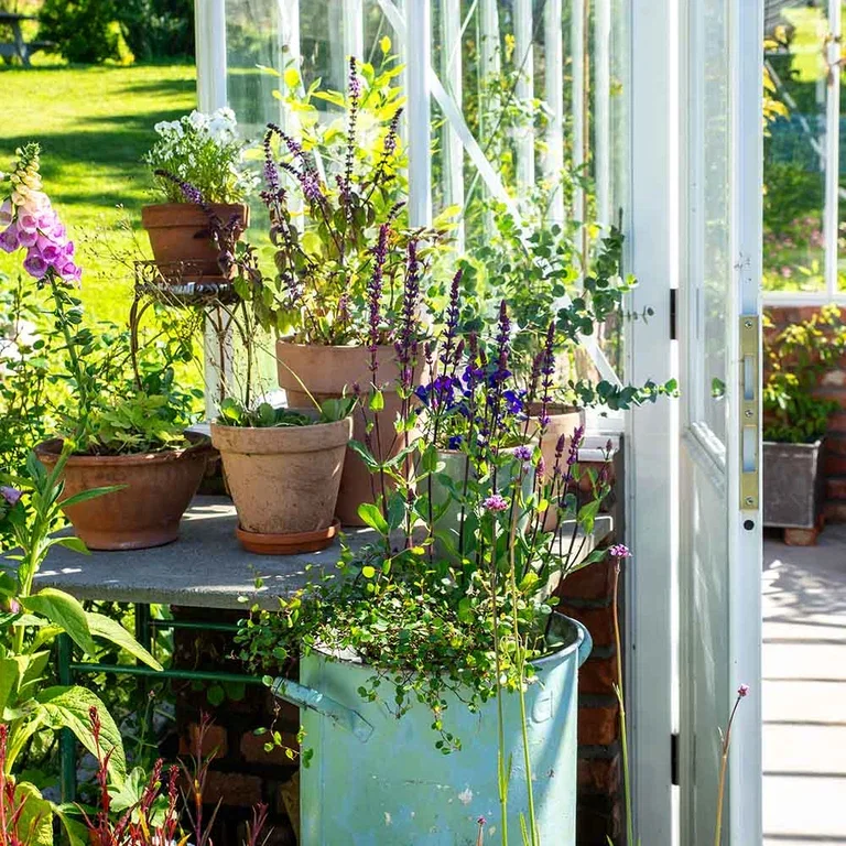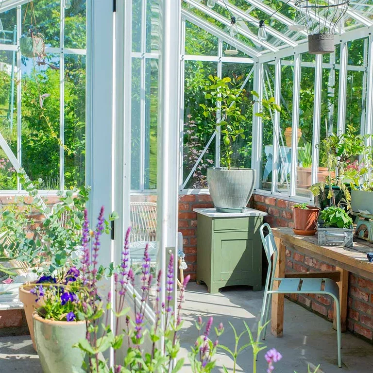 Det hvite drivhuset deres har brostein både som grunnmur og innramming, et materiale man ofte ser sørover i Europa. Uttrykket er mikset med rustikke møbler. Potter i ulike størrelser i keramikk og terracotta er plassert i grupper utenfor drivhuset som på et lite torg i Frankrike. Noen av pottene og møblene har fått et malingsstrøk av mintfarge for å inkludere Middelhavet i sommerfesten.