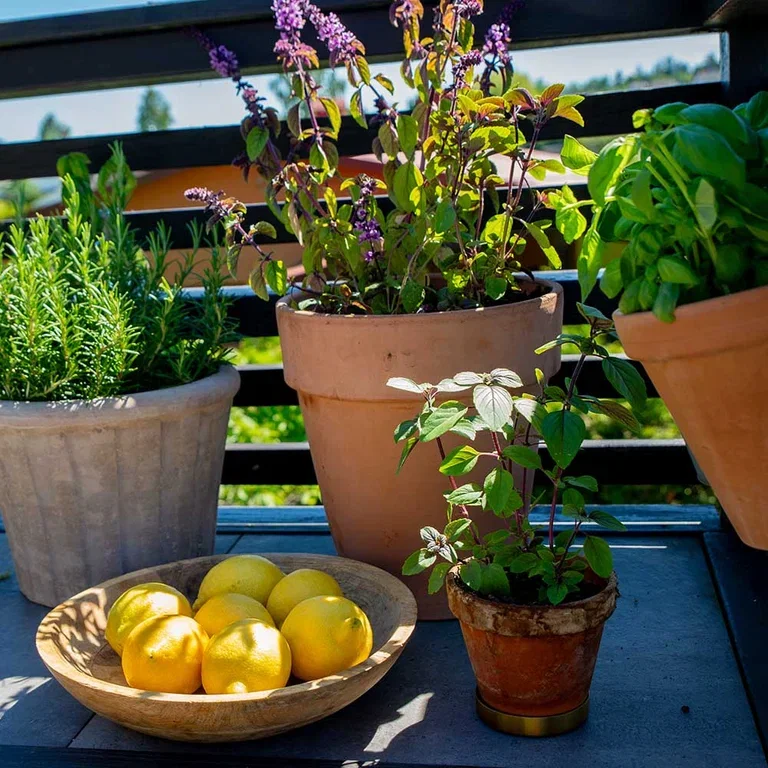 Potter med rosmarin og basilikum setter en spiss på matlagingen på utekjøkkenet. Sitronene bidrar også med smak og følelse av Sør-Europa.