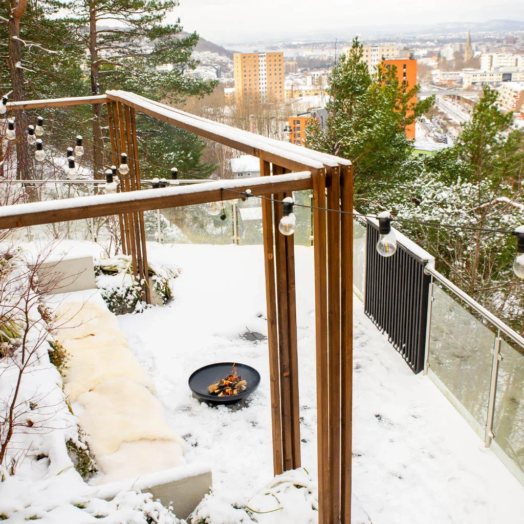 – Vi liker å rigge oss til med saueskinn på det nederste nivået i hagen. Derfra har vi nydelig utsikt utover byen og fjorden. Her, på taket av Oslo, tenner vi gjerne i bålpannen, griller pølser, marshmallows og drikker kakao. Det er spesielt hyggelig når det er snø i lufta.