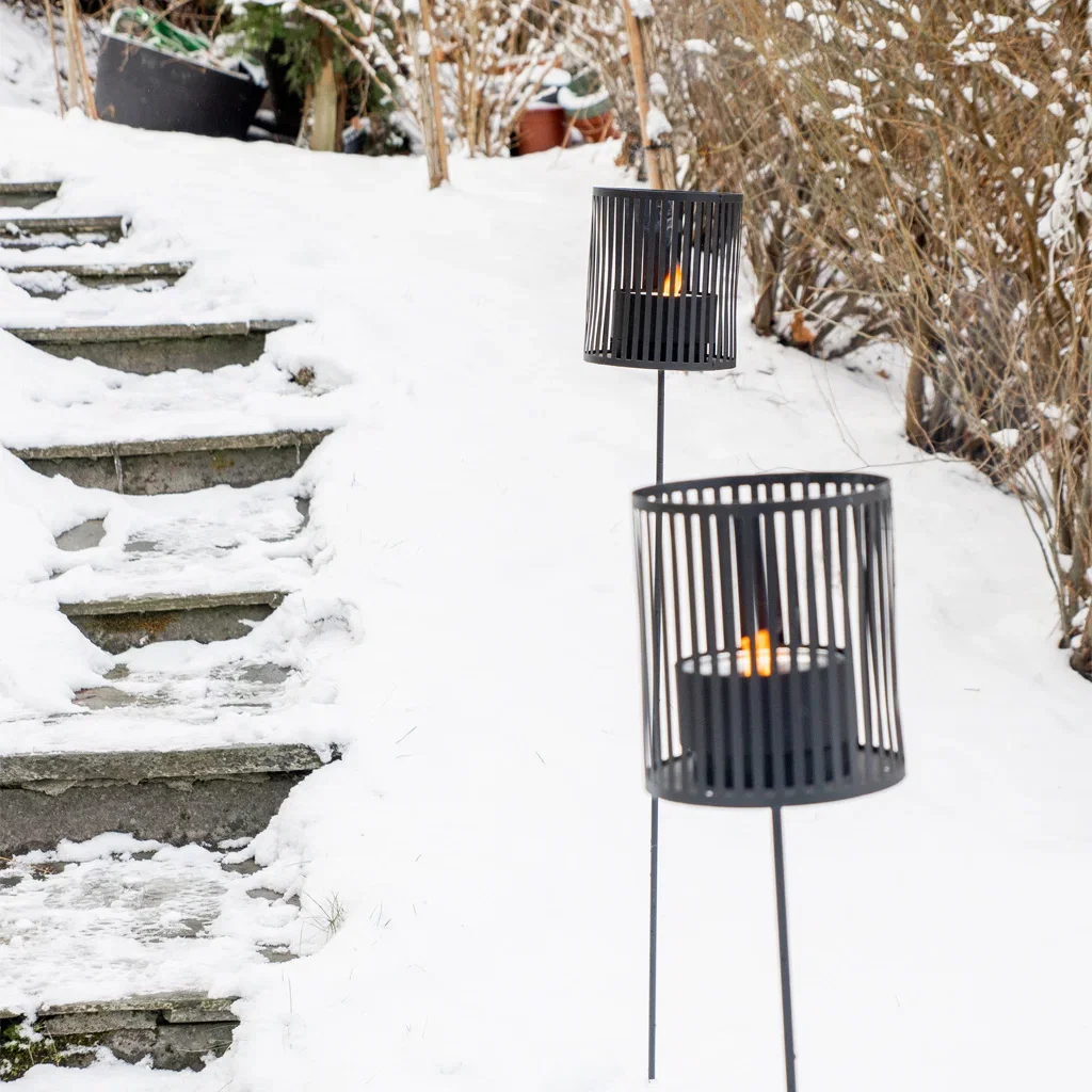 Sorte fakler langs trappen ned til hagen skaper stemning.