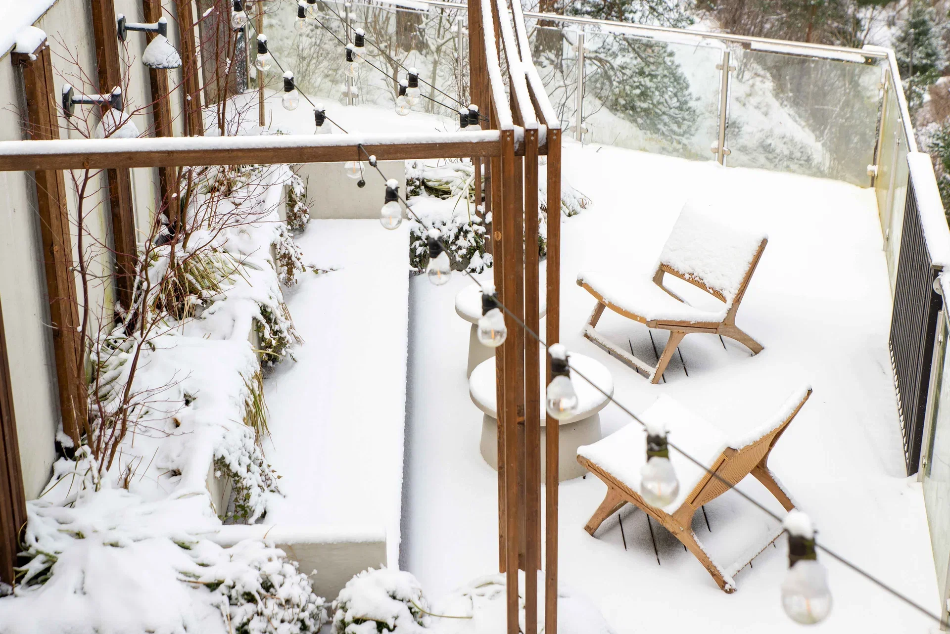 Fotspor i snøen leder oss nedover trappene i den skrånende hagen. Høye, tente fakler rammer inn hagestien som leder ned til uterommets nederste nivåer. Snøen over det tildekte bassenget danner et hvitt teppe midt i uterommet nå i mars. Det overbygde utekjøkkenet er omkranset av høye furutrær med snødekte trekroner som svaier i vinden.