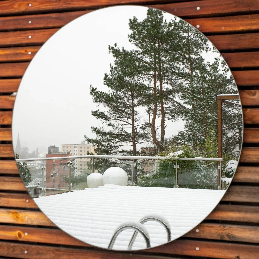 Den nordiske hagestilen kombinerer spennende former med ulike uttrykk. Det runde speilet mot de stramme spilene skaper en spennende kontrast. I speilet sees hagens snødekte basseng.