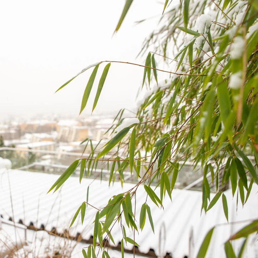 De spisse, grønne bladene til den eviggrønne bambusen fremheves ekstra med et dryss av snø.