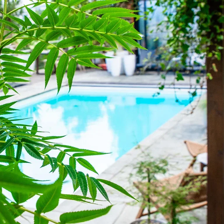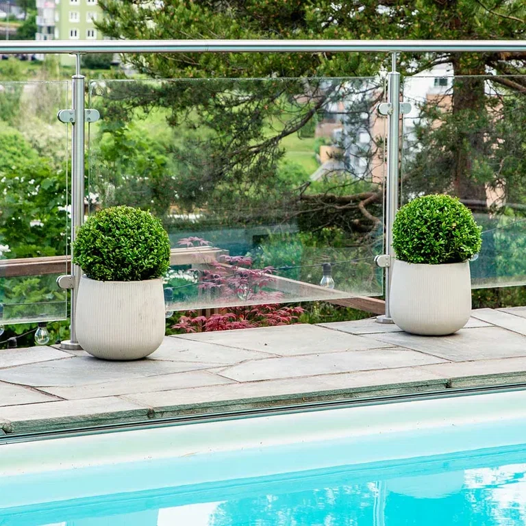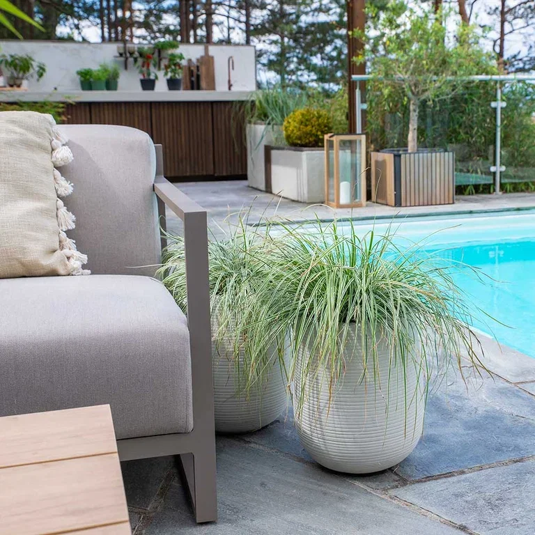 Typisk for den nordiske stilen er gjentagelse av planter for å skape helhet og ro. Tre formklippede buksbom er plassert i potter langs bassengkanten.