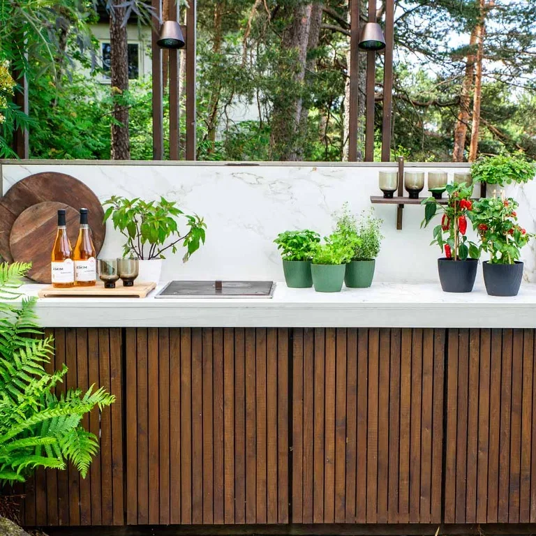 Familien er glad i å lage mat under åpen himmel. Utekjøkkenet er hagens nyeste rom. De høye, frie trærne i skogen som omgir tomta skaper en spennende kontrast mot de stramme formene på benken og skapdørene.