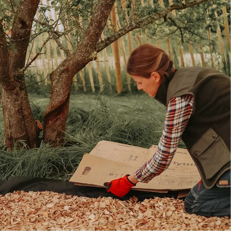 Start med å dekke bakken med tykk papp, for eksempel flytteesker, eller legg ut flere lag med tynnere papp eller aviser. Pass på å legge de om hverandre, slik at ugresset ikke har mulighet til å finne lys og presse seg gjennom noen glipper i pappen.